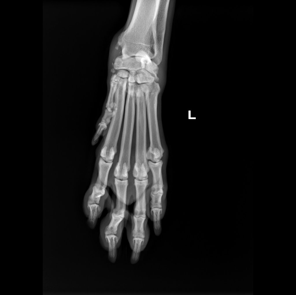 x-ray with awake patient was performed on forelimb (medio-lateral view of elbows and dorso-palmar view of carpus) and latero-lateral view of thoracic and lumbar vertebrae.